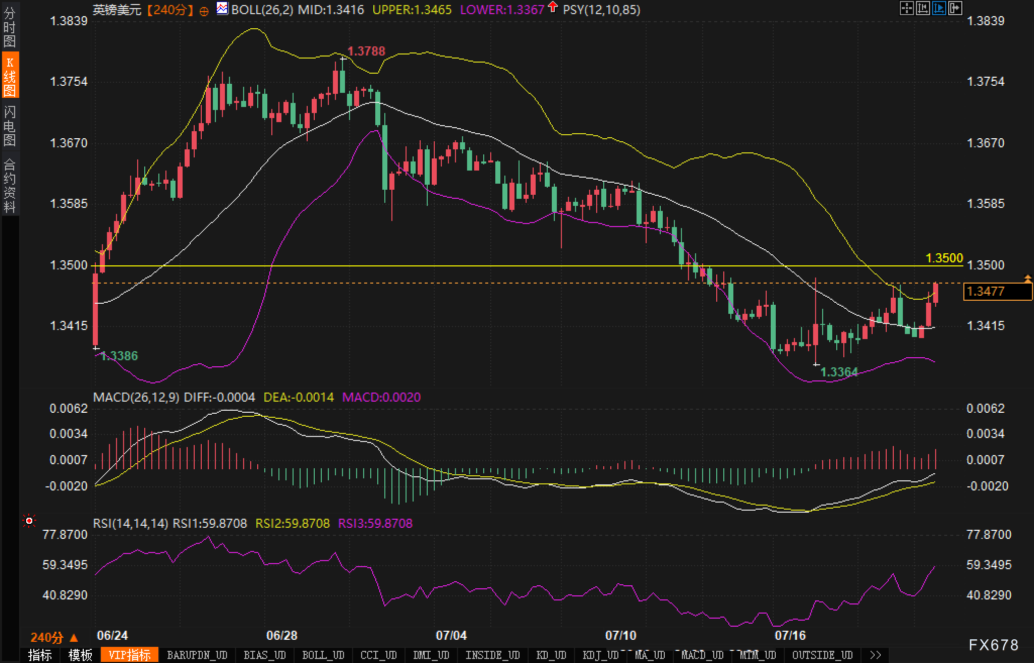 240分钟K线图显示,GBP/USD自高点1.3788回落至近期低点1.3364后,出现温和反弹。当前汇价处于布林带上轨(1.3465)上方,并逼近重要阻力位1.3500。