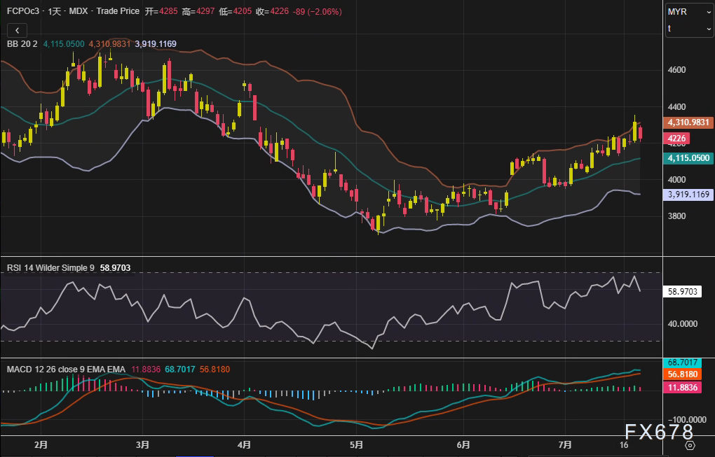 盈凯外汇官网报道——周一(7月21日),马来西亚衍生品交易所(BMD)棕榈油主力合约FCPOc3收于4226林吉特/吨,单日下跌89林吉特(2.06%),终结前一交易日反弹势头。技术指标显示,MACD柱状线收缩至11.88,RSI(14)回落至58.97,价格跌破布林通道中轨4115林吉特支撑,短期动能明显转弱。