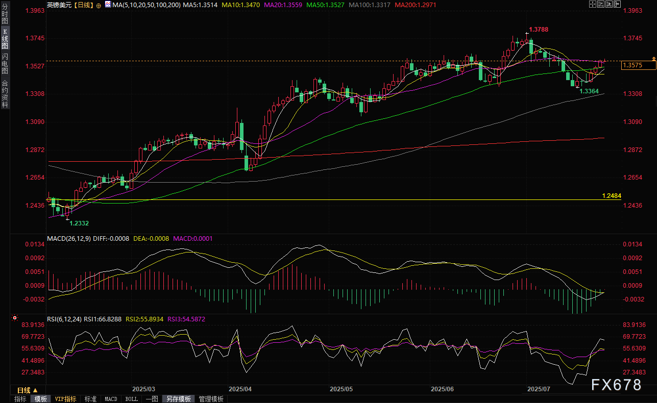 受市场对贸易协议的乐观预期影响,美元遭遇抛售,英镑兑美元持续走强,周三连续第三个交易日上涨,逼近1.3600关口。市场普遍认为,特朗普政府可能在8月1日“互惠”关税“截止日”前与其他方达成最后一刻贸易协议,这一预期推动投资者情绪升温,也加剧了美元的抛售压力,为英镑兑美元的涨势提供支撑。