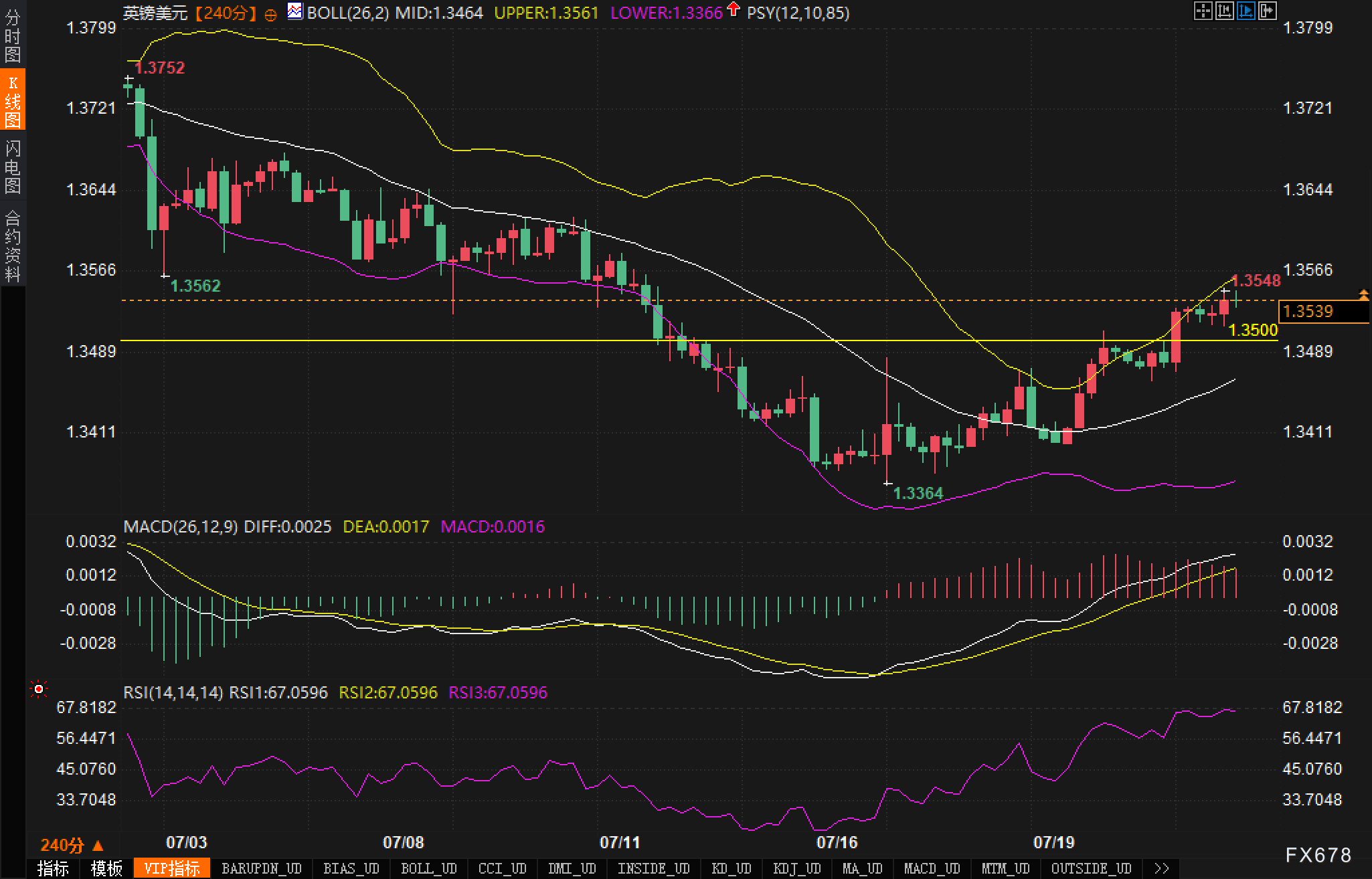 盈凯外汇官网报道——周三(7月23日),英镑兑美元(GBP/USD)延续反弹走势,日内最高触及1.3548,维持在布林带中轨上方震荡。尽管英国财政风险再度引发关注,但市场对于英国央行即将降息的预期与美元的弱势共同影响了英镑汇价。短期内,交易员将密切关注即将公布的英国与美国7月PMI初值数据,作为判断两国经济动能的重要依据。