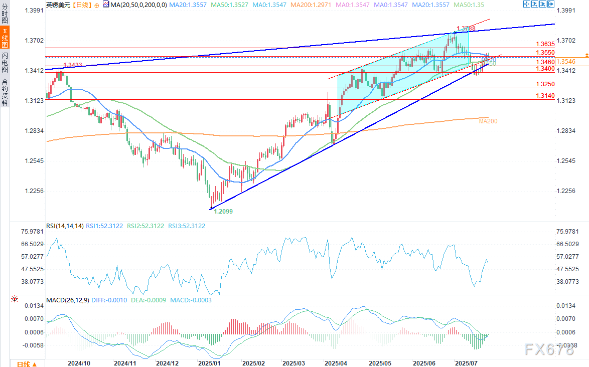 英国7月PMI弱于预期,增加了英镑压力(标普全球数据显示,英国综合PMI近期跌至48.2,制造业PMI为44.0,均为数月低点,反映经济增长放缓)。尽管如此,市场风险偏好增强,全球波动性下降(VIX期货走低),使得英镑在低波动环境中获得一定支撑,英镑/美元迅速反弹,重回50日均线和1.3530上方,显示买盘强劲。