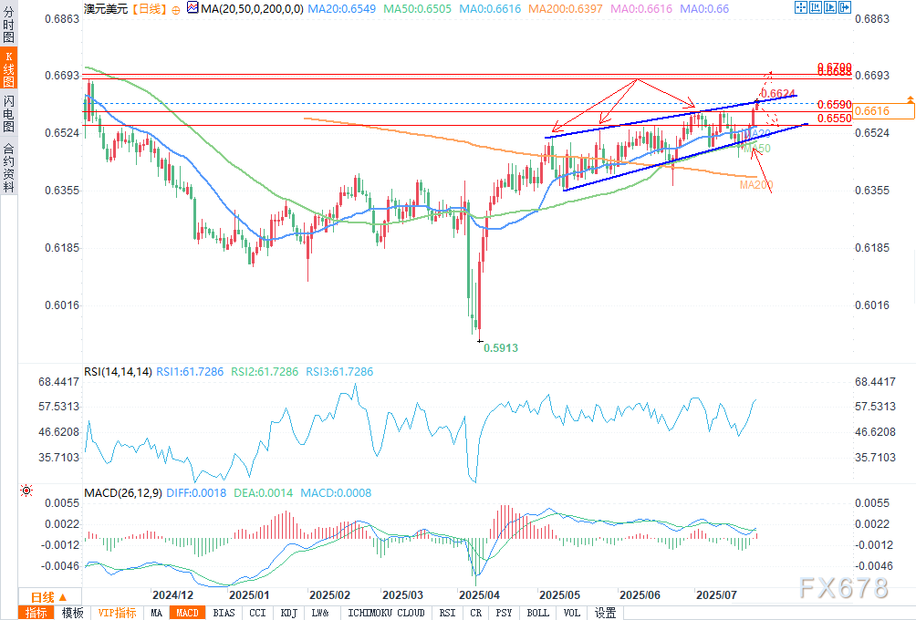 盈凯外汇官网报道——澳元/美元创下2025年新高,但目前正面临数月来上升通道顶部的关键技术考验。由于动能仍向上,看涨突破看似可能,尤其是若即将与中国或欧盟达成的贸易协议最终落地。尽管如此,下周澳大利亚二季度通胀报告仍可能成为“意外因素”,若通胀数据低于澳洲联储预期,可能加剧短期降息风险。