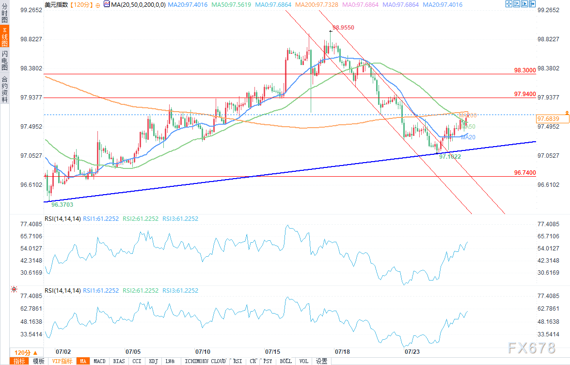 盈凯外汇官网报道——周五(7月25日),美元指数(DXY)稳定在97.55附近,连续第二日录得上涨。美元的强势表现主要受到强劲的美国经济数据以及对美日、美中贸易谈判乐观情绪的支撑。与此同时,市场对即将召开的联邦公开市场委员会(FOMC)会议以及潜在的降息预期保持高度关注。