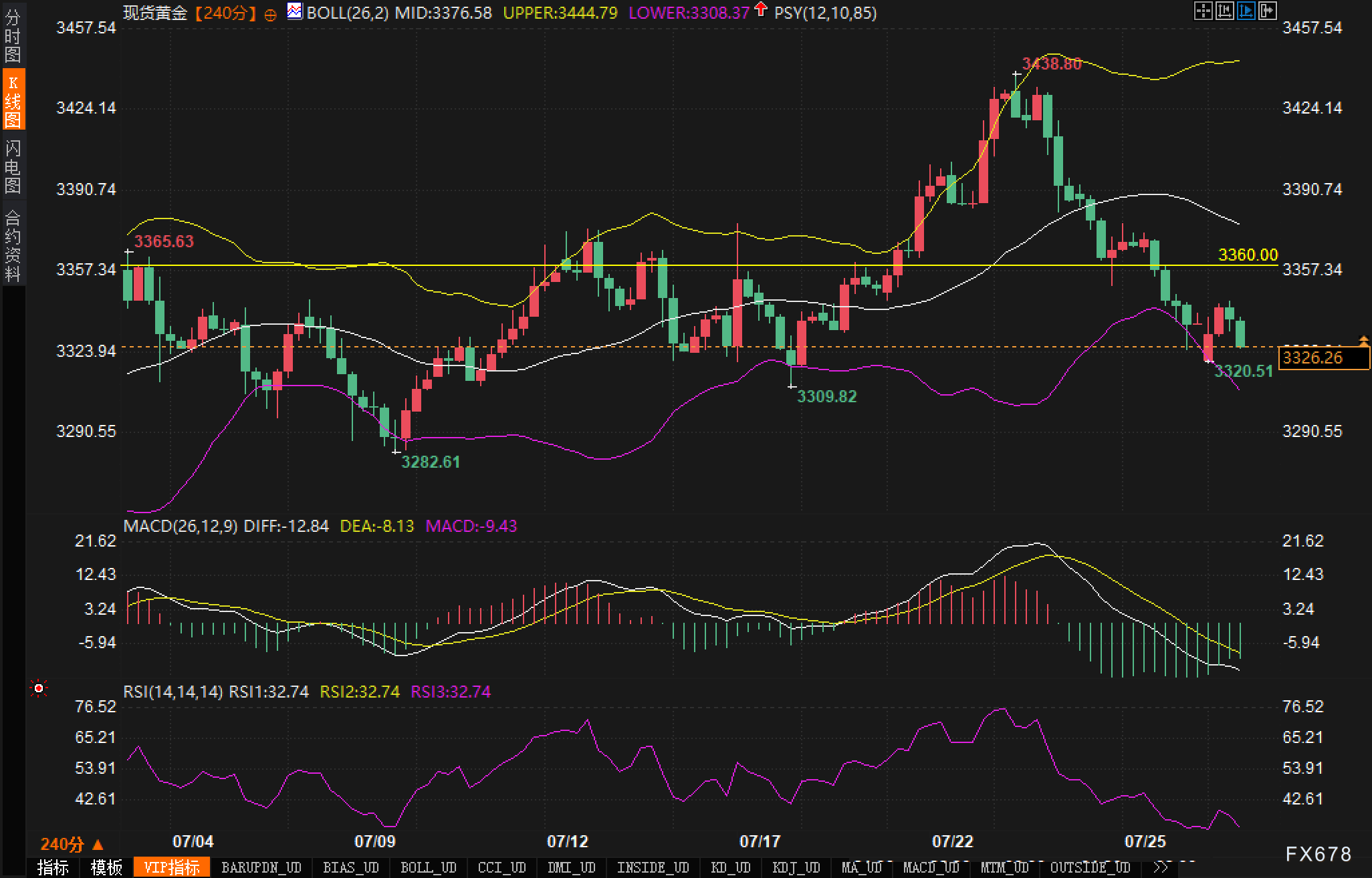 盈凯外汇官网报道——周一(7月28日),现货黄金维持弱势震荡格局。北美时段黄金报价约为3325美元/盎司,整体运行于窄幅区间。消息面上,美国与欧盟达成贸易协定,在数字服务、农业与清洁能源领域深化市场准入,促使美元企稳回升,权益市场人气提振,市场风险偏好明显修复,削弱了避险资产的吸引力。与此同时,美联储降息预期边际降温,贵金属走势持续承压。