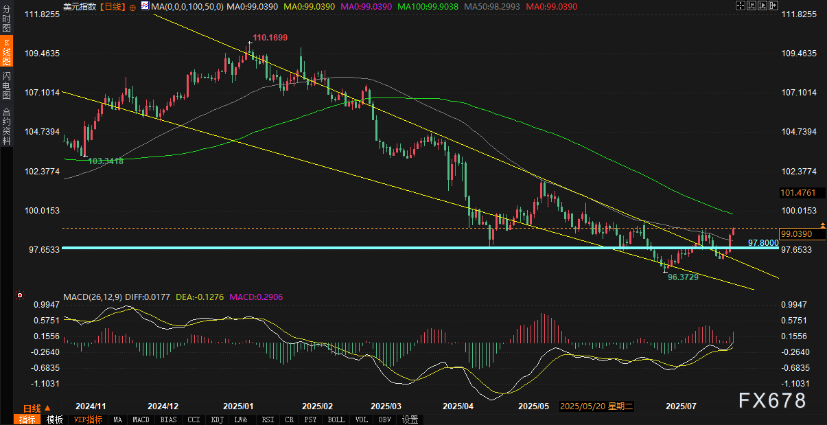 盈凯外汇官网报道——周二(7月29日),美元指数(DXY)延续近期强劲涨势,最新报价徘徊在98.89附近,巩固了周一1%的单日涨幅——这是自5月以来最强的单日表现。受美欧贸易协议框架达成以及市场对美国经济数据和美联储政策的乐观预期推动,美元指数7月以来已累计上涨超2%,有望录得自去年12月以来首次月度上涨。尽管日内稍有回落,美元指数仍守住关键支撑位,市场情绪在贸易乐观情绪和经济数据预期中保持谨慎乐观。本文将从基本面和技术面角度深入分析美元指数的最新动态,并结合市场情绪和关键数据展望未来走势。