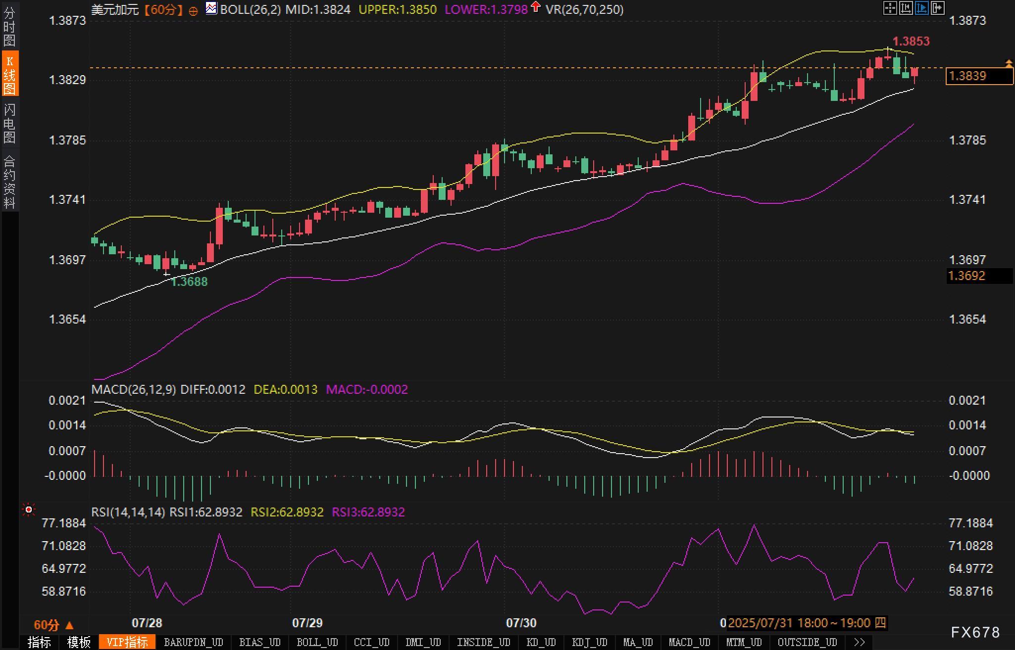 从小时K线图来看,美元兑加元的汇价呈现明显上升趋势。布林带中轨位于1.3824,上轨1.3850,下轨1.3798,汇价目前运行于中上轨之间,显示短线多头占优。