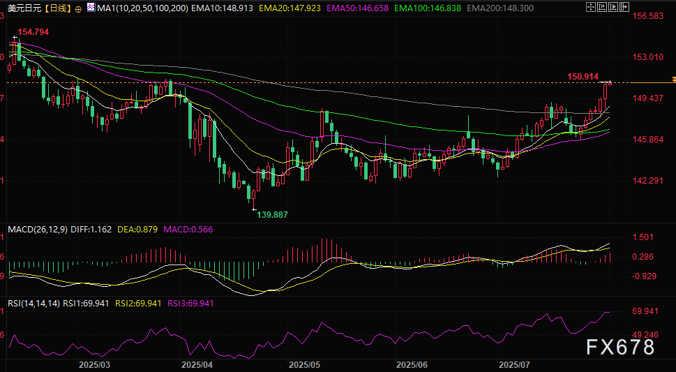 盈凯外汇官网报道——周五(8月1日)亚洲时段,美元兑日元维持偏强震荡,现涨0.04%交投于150.80附近,延续隔夜0.91%的涨势,汇价此前已经连续六日上行。日本核心通胀数据略低于预期削弱日元支撑,叠加美元指数短期企稳,推动汇价小幅攀升。日经225指数早盘微跌0.32%,暂报40926点,维持在历史高位区间震荡。