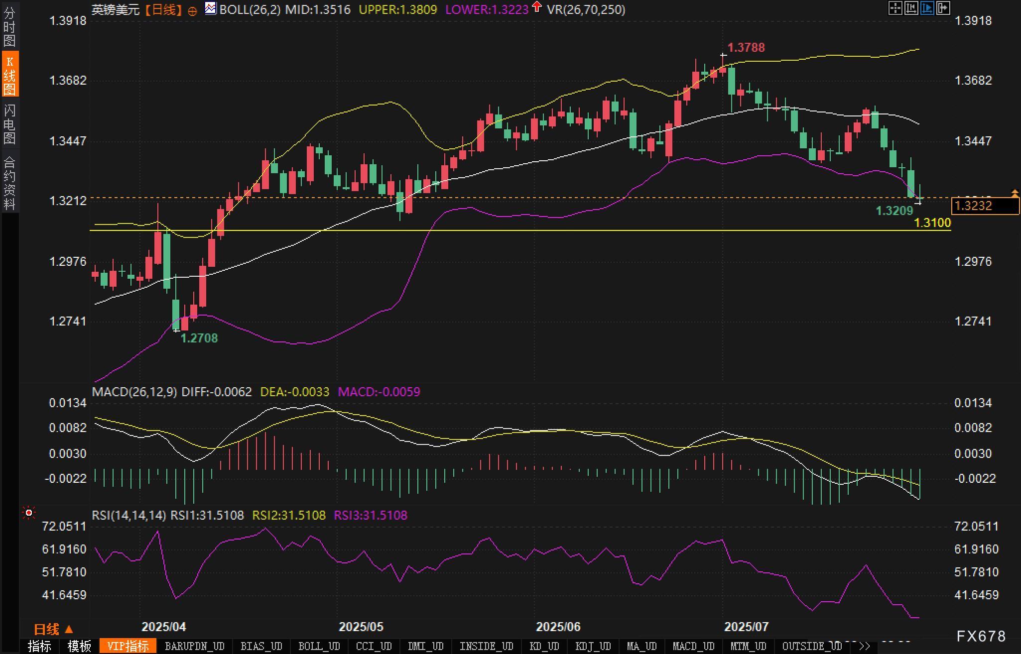 整体来看分析认为,英镑兑美元当前处于下跌趋势之中,布林带开口扩张、K线贴近下轨运行,技术性结构偏空,若跌破1.3100,恐将引发新一轮加速下行。