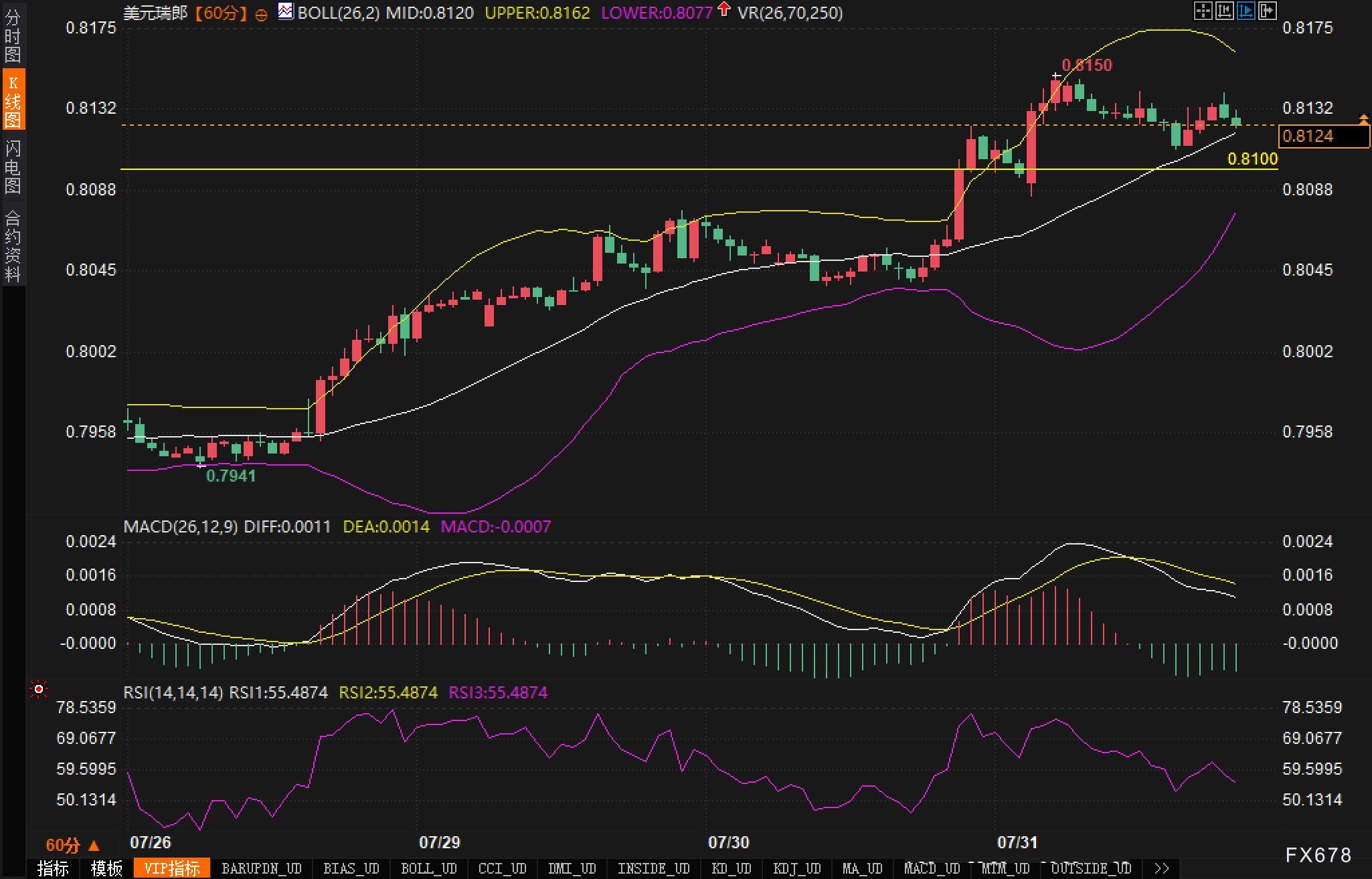 盈凯外汇官网报道——美元/瑞郎近期拉升明显,最高测试0.8150附近,为近四周以来新高。周四(7月31日)汇价高位震荡整理,美市盘前交投于0.8110上方。当前市场正聚焦即将公布的7月PCE物价指数,以进一步判断美联储的货币政策前景。
