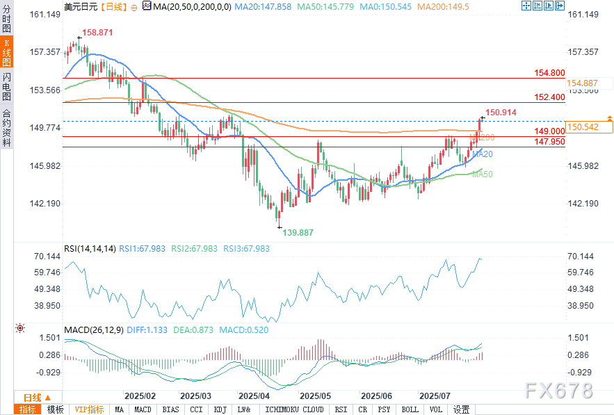 尽管日本央行上调了2025财年核心CPI预测至2.7%,但其表示近期无意加息,尤其是考虑到7月20日自民党选举失利带来的国内政治不确定性。这种鸽派立场削弱了日元多头的信心。