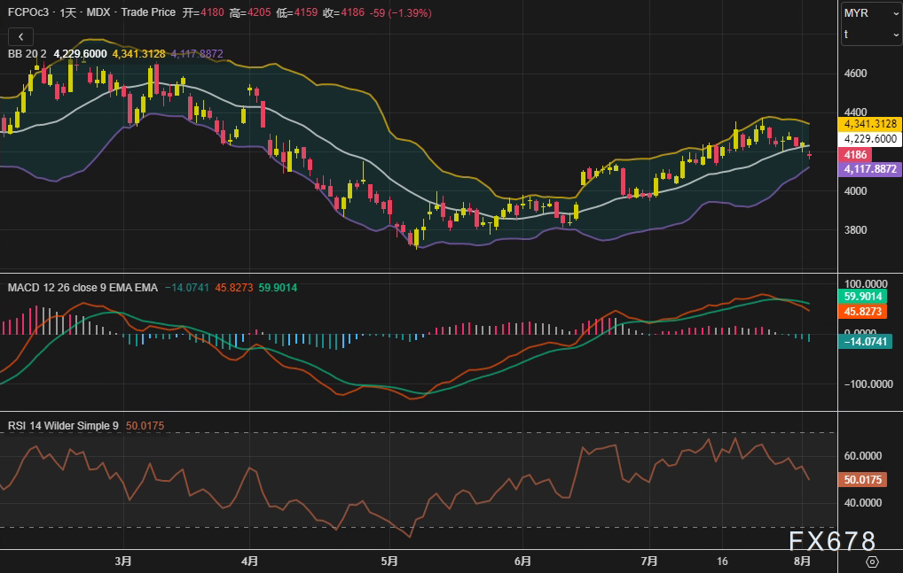 盈凯外汇官网报道——周一(8月4日),马来西亚衍生品交易所(BMD)棕榈油主力合约FCPOc3收跌1.39%,报4186林吉特/吨,盘中技术指标呈现多空交织态势:布林带(20,2)中轨位于4341林吉特,而RSI(14)暂稳于50.01中性区间。市场情绪明显受到基本面利空主导,尤其是库存持续累积与产量回升的预期,叠加外围油脂市场疲软,共同压制价格表现。