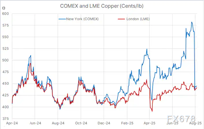 然而,上周特朗普突然反转态度,宣布至少在2027年1月之前,期货交易所交易的精炼铜将被排除在关税之外,这一交易随之瓦解。纽约市场的溢价在几分钟内崩盘,交易商蒙受损失,美国仓库的铜库存达到21年以来的最高水平。随着进口即将枯竭,美国铜价现在可能会跌至全球基准价格下方,以清理过剩库存。