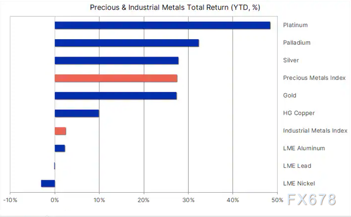 在经历了出色的上半年之后,投资类金属在7月进入盘整阶段,铜价的剧烈波动引发了一些市场波动。黄金已横盘整理四个月,这让白银和铂金有机会迎头赶上。今年以来,黄金和白银的涨幅接近27%,铂金接近50%,投资者自然会问:涨势是否已经结束?