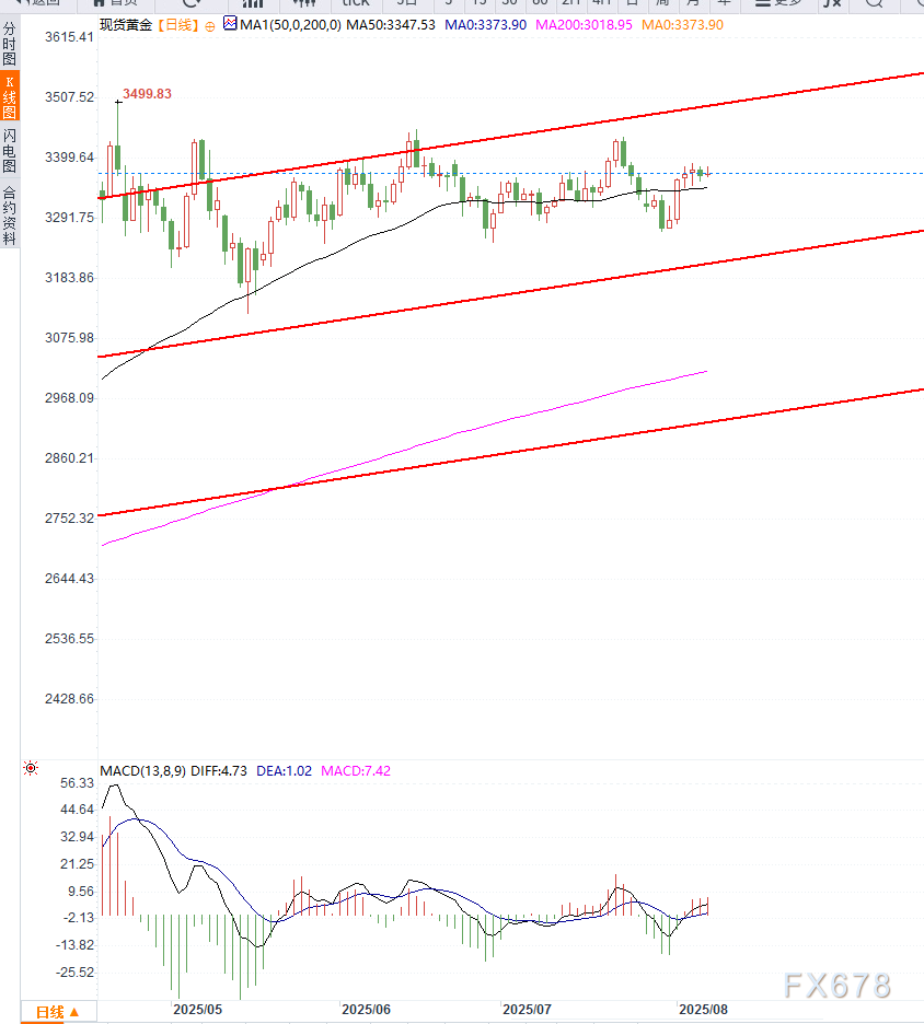 4小时图则更具积极信号:本周金价成功从200周期均线反弹,若价格突破3400美元,将确认短期上涨趋势延续,目标位依次指向3420-3422美元区间,强阻力区域则位于前高3434-3435美元附近。一旦突破,或将向历史高点3500美元迈进。