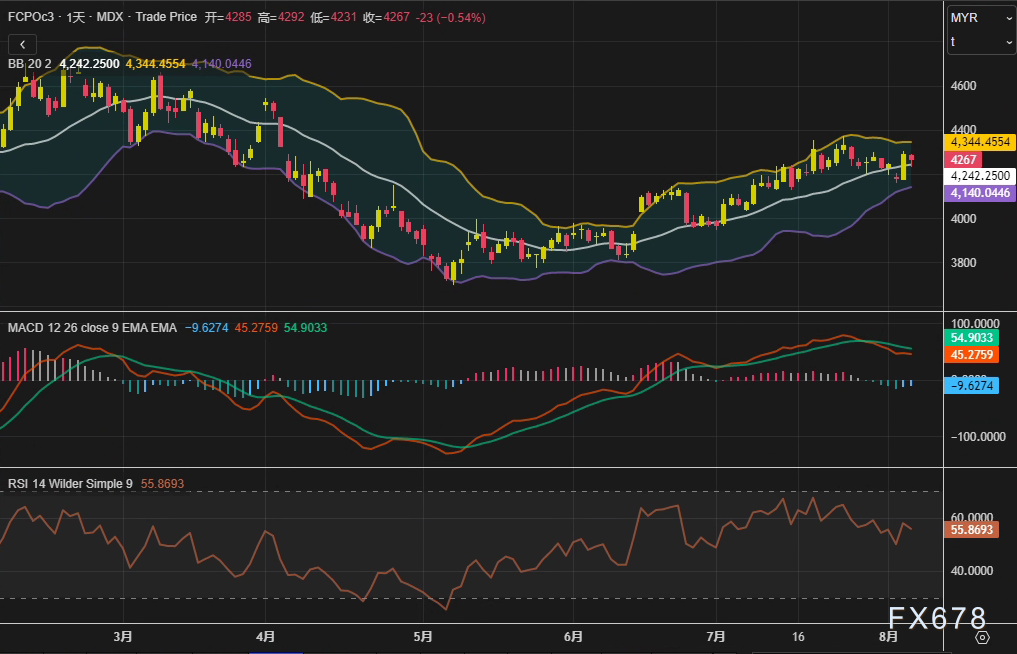 盈凯外汇官网报道——马来西亚棕榈油期货周三(8月6日)延续震荡走势,主力FCPOc3合约10月交割价收报4,267林吉特/吨,日内下跌23林吉特(跌幅0.54%),盘中波动受制于需求端疲软与替代油脂价格支撑的双重影响。技术面显示,日线级别布林带(20,2)收窄,MACD(12,26,9)柱状线缩量,RSI(14)徘徊于50中性区域,显示市场暂缺明确方向性驱动。