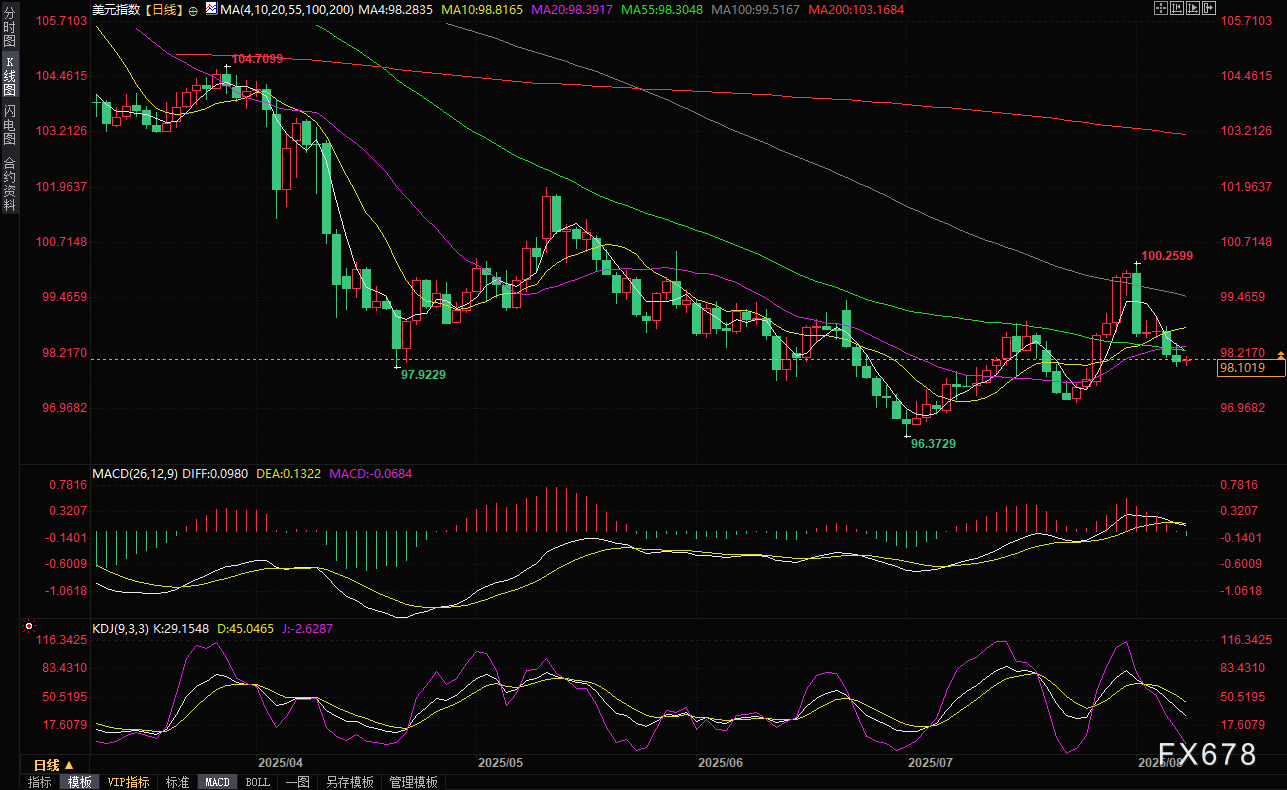 盈凯外汇官网报道——美元正面临多重压力,市场情绪因美联储人事变动预期和英国央行出人意料的“鹰派”降息而波动加剧。美元在本周表现疲软,美元指数已下跌近0.7%,周五(8月8日)亚市窄幅震荡,目前交投于98.07附近,预计将录得周线跌幅。与此同时,英镑在英国央行降息决定后表现坚韧,守住两周高点,而欧元和其他主要货币也在地缘政治和经济数据的双重影响下展现出复杂走势。
