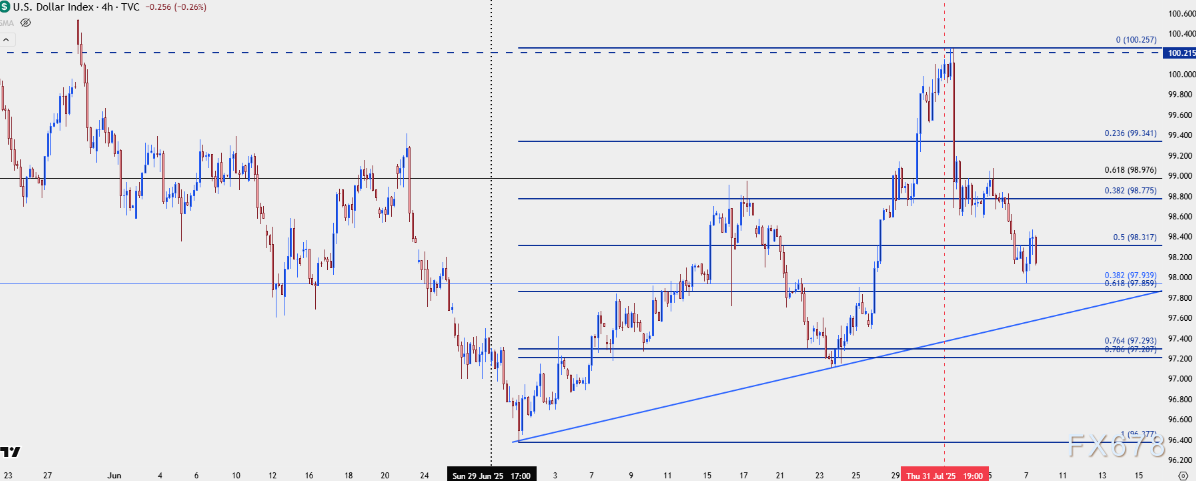 此后,阻力位在102的斐波那契水平,而六月初美元继续走弱,创下三年新低。但自那以后,空方似乎难以重新掌控局面,七月形成了底部逐渐抬升的走势。这让我们来到当下——问题在于是否能再形成一个更高的低点。