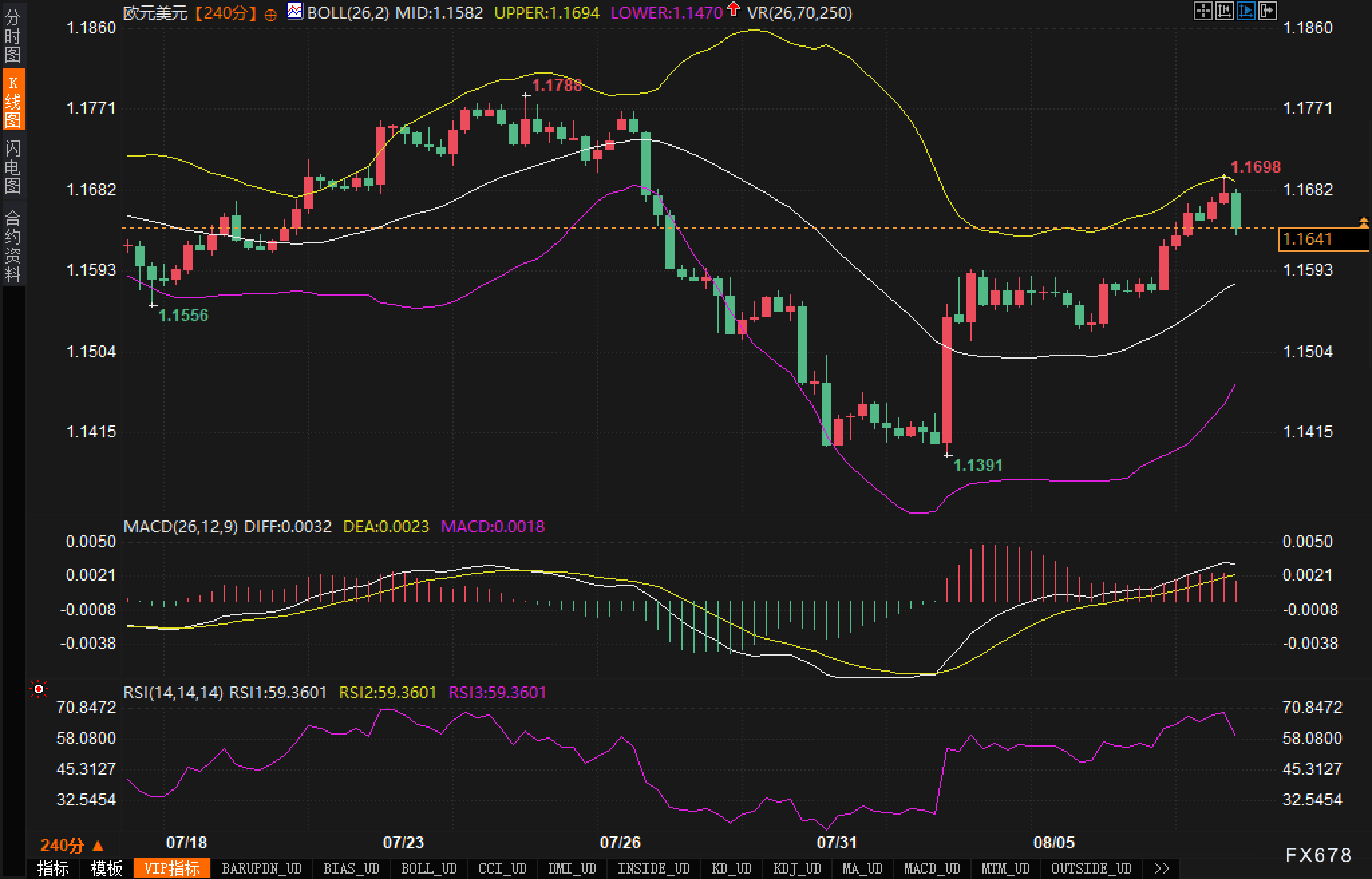 四小时K线图显示,欧元/美元整体呈现“V型反转”结构,自1.1391低点反弹后,连续走高,目前逼近布林带上轨1.1694。布林带呈现扩张迹象,暗示波动率提升,汇价有望向上试探前高1.1788的阻力区域。
