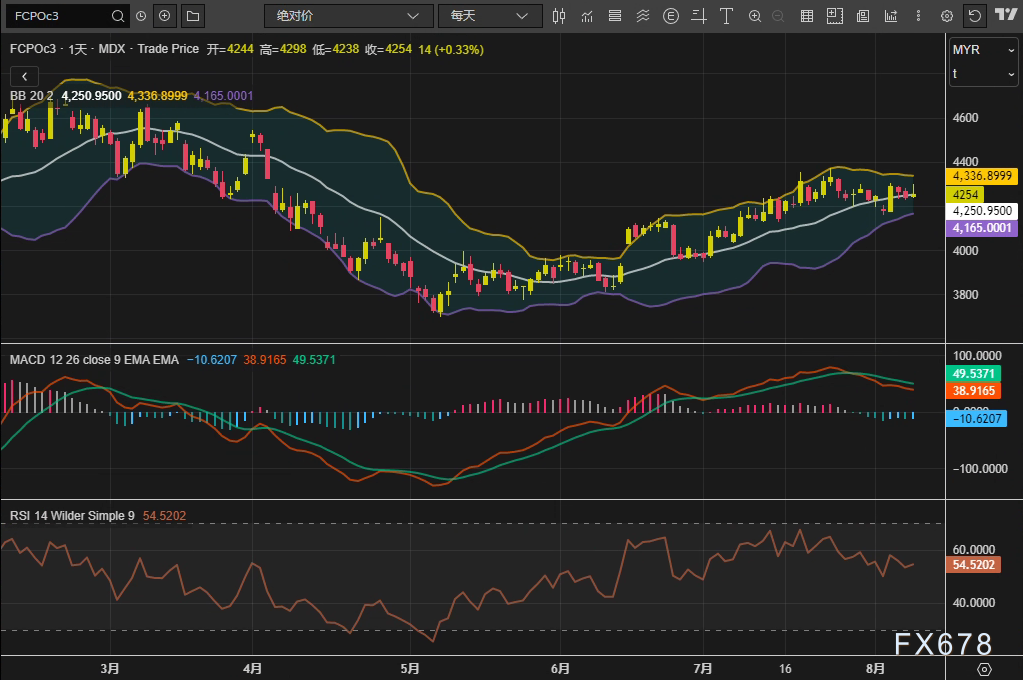 盈凯外汇官网报道——周五(8月8日),马来西亚衍生品交易所(BMD)棕榈油主力合约(FCPOc3)收于4254林吉特/吨,单日涨幅0.33%,周线微升0.21%,终结此前两周连跌。技术面显示,价格站稳布林通道中轨(4250林吉特),MACD柱状图收窄,RSI中性区间徘徊,市场短期呈现企稳迹象。