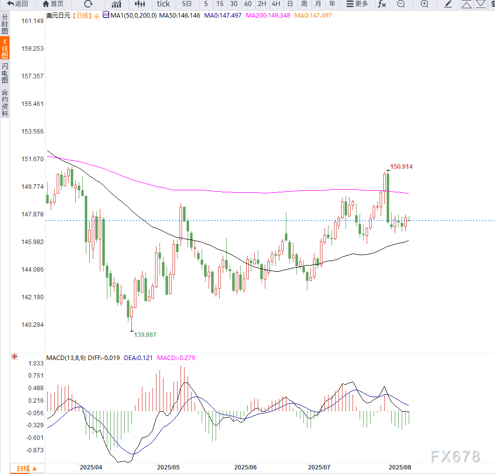 美元兑日元日内维持在147.00至147.80区间震荡,形成矩形整理格局。若汇价能有效突破147.80压力区(对应7月涨势的38.2%斐波那契回撤位),并站稳148.00上方,或将触发买盘推动价格上探148.50区域,进一步目标为149.00关口。