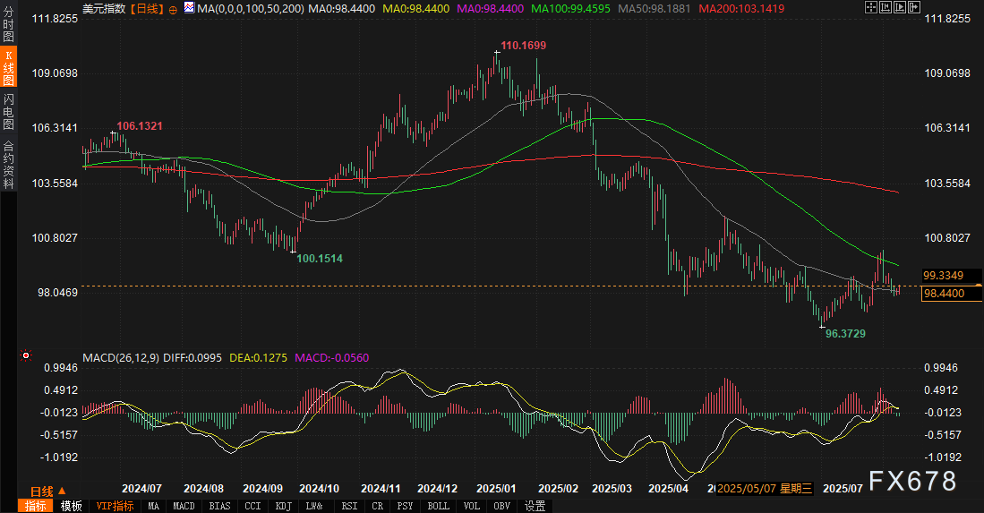 盈凯外汇官网报道——周一(8月11日),全球金融市场在关税言论、俄乌局势持续发酵以及美联储货币政策预期调整的背景下,呈现出复杂而微妙的波动。美元指数最新报98.4570,日内小幅上涨0.21%,显示市场在多重风险事件前保持谨慎。美债市场方面,10年期美债收益率最新报4.27%,较前一周略有回落,但长端收益率受关税引发的通胀预期及债务供应压力影响,整体仍维持高位。市场关注焦点集中在即将发布的美国7月CPI数据、俄乌局势相关会谈,以及美联储降息路径的不确定性。本文将结合基本面与技术面,深入分析美债与美元市场的联动性,并展望未来趋势。