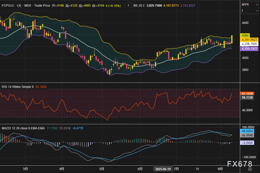 盈凯外汇官网报道——周一(8月11日 ),马来西亚衍生品交易所(BMD)棕榈油主力合约今日大幅收涨3.03%,报每吨4384林吉特,创下自4月3日以来的最高收盘价。这一强势表现直接受到马来西亚棕榈油局(MPOB)7月库存数据及船运机构出口预估的提振。技术面上,合约日线MACD金叉初现,RSI站上63.18的中性偏强区间,布林通道上轨被突破至4107林吉特,显示短期动能充沛。