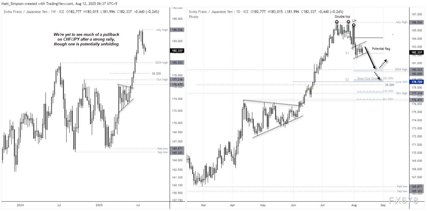 186.00关口的月线级别双顶形态形成,暗示动能转变。若回撤2-7月涨势的38.2%斐波那契位,汇价可能下探179.00下方,该区域与6月价值区间高点(VAH)形成技术共振。