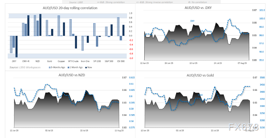 自7月起澳元与纽元的相关性最强。周二(8月12日)的澳洲联储会议可能会成为这两种货币出现分化的催化剂。尽管澳元兑美元与美元指数在 10 天内的反向相关性略有减弱,但仍保持在 - 0.86 的较强水平。