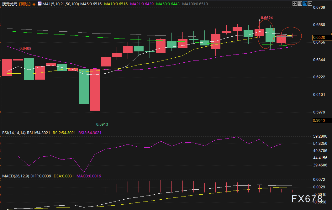 美国商品期货交易委员会(CFTC)的数据显示,澳元兑美元净空头头寸已攀升至数月高点,大型投机者和资产管理公司均大量做空。近期的看空外部周形态表明卖方占据主导地位 —— 但如果澳元兑美元在澳洲联储会议后保持稳定,空头回补可能会引发一轮涨势,向 0.66 迈进。