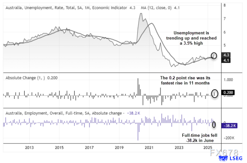 澳洲联储做出决定后,周三的工资价格指数(WPI)和周四的就业报告将接踵而至。一次谨慎的降息,再加上疲软的就业数据,可能会给澳洲联储提供 10 月或 12 月再次降息的宽松理由。由于全职就业人数已减少 38.2 万人,与此同时,根据澳大利亚统计局(ABS)的数据,6月份失业率从5月的4.1%上升至4.3%。失业率处于三年半的高点,澳元空头将密切关注新的汇价下行催化剂。就业报告的其他细节显示,6月份就业人数增加了2000人,但全职就业人数减少3.82万人。市场预测澳大利亚储备银行将继续下调其基准利率,到明年年初达到3.10%或更低。