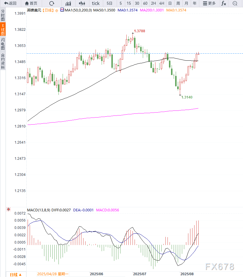 在美国方面,劳动力市场降温推高了降息预期。CME FedWatch工具显示,美联储9月降息25个基点的概率已从85%升至94%。市场分析指出,这种快速升温的降息预期可能对美元构成持续压力,从而支撑英镑。