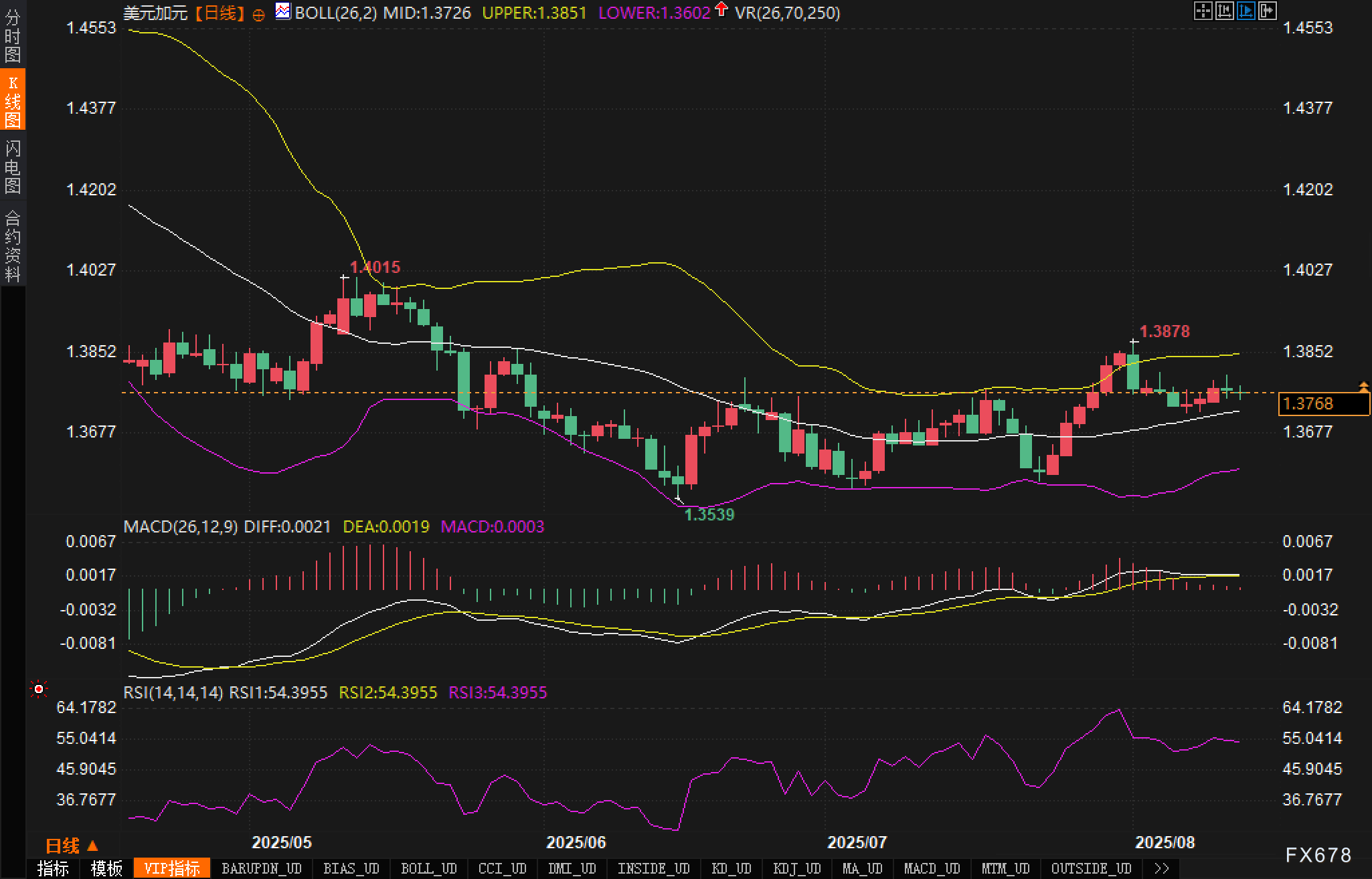 从技术面图表来看,美元/加元的走势仍然处于区间震荡状态。下方支撑位位于1.37附近,而上方阻力位则集中在1.3878一线,价格在这一区间内波动,尚未突破当前的区间震荡模式。