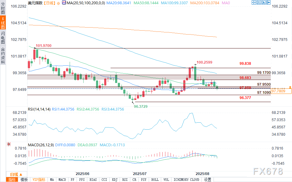从技术面来看,美元指数已跌破其50日移动平均线(98.10),目前正在测试近期支撑位97.945。若持续走低,下行风险将指向97.109以及7月低点96.377。阻力位在98.317和98.683,更强的上方阻力位于99.177和99.838附近。在200日移动平均线(104.086)下方,长期动能仍处于看跌状态。