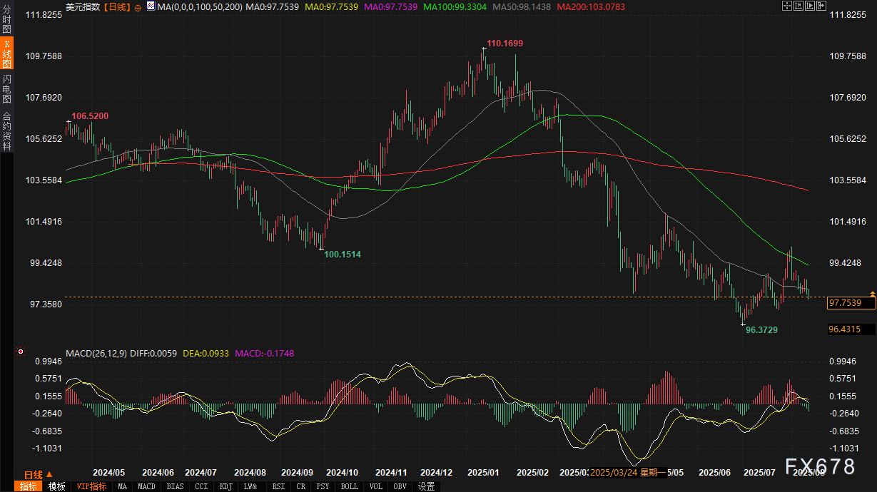 在日线图上,美元指数当前运行于50日均线(98.1440)下方,距离100日均线(99.3306)和200日均线(103.0783)较远,显示中期趋势仍偏空。50日均线的失守进一步强化了空头信号,短期内若无法快速收复该均线,美元指数可能继续下探。长期均线(200日均线103.0783)与当前点位的较大差距表明,美元指数自年初高点110以来的调整尚未触及长期支撑,未来可能仍有下行空间。