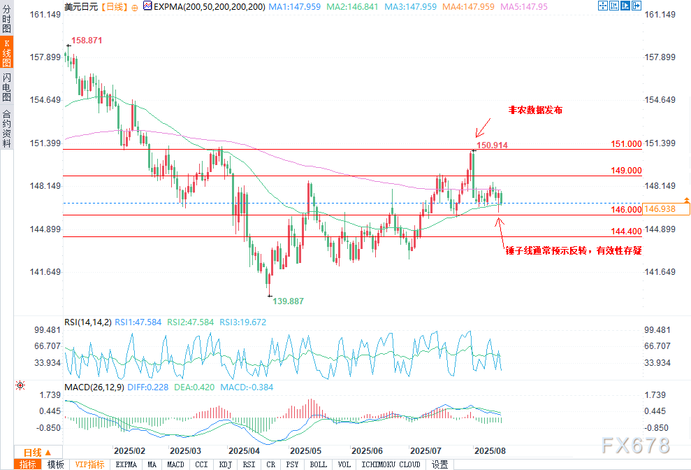 若数据推动汇率突破当前震荡区间,支撑位将分别见于146.00与144.40,阻力位则位于149.00与151.00。
