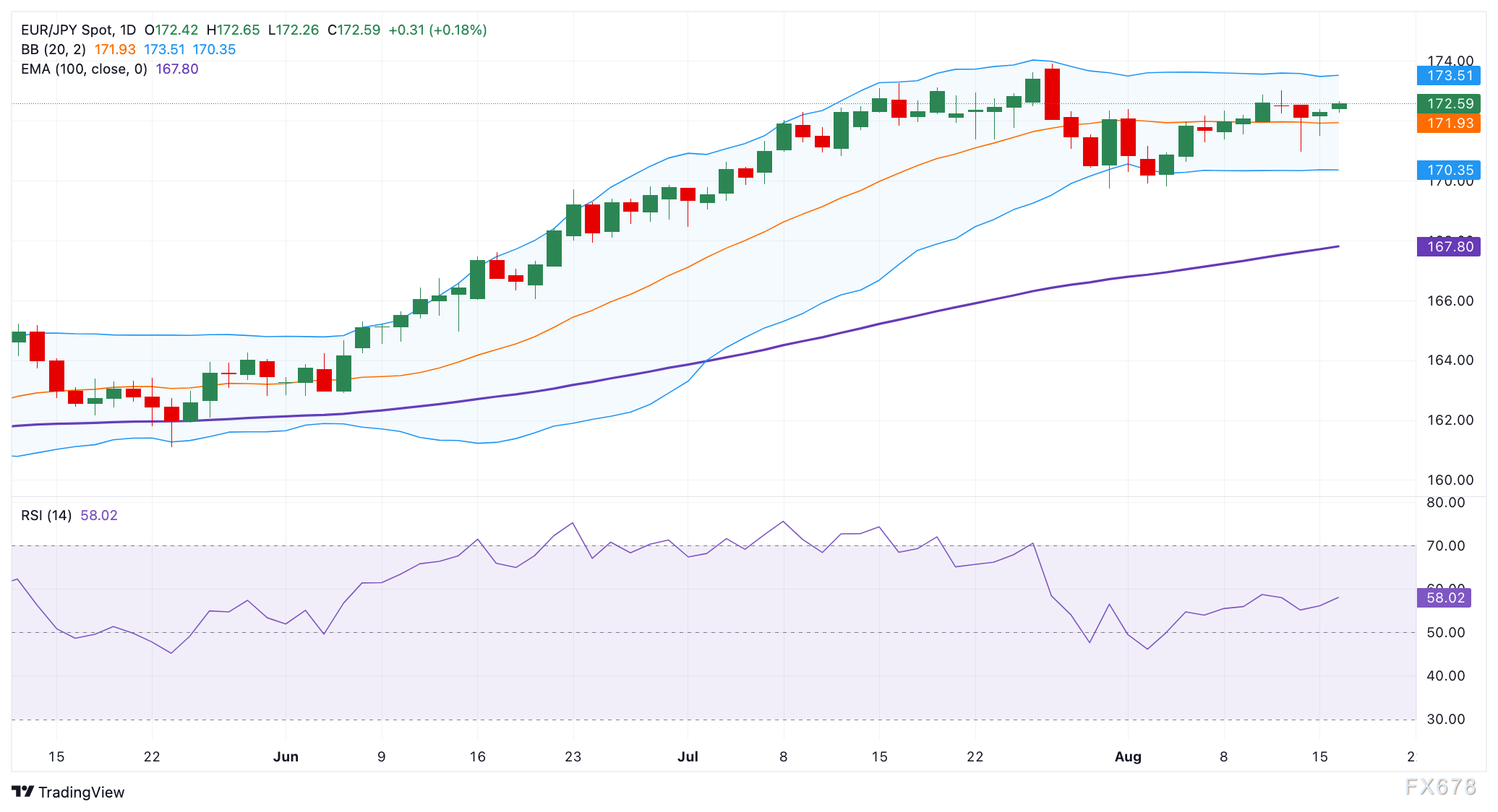 盈凯外汇官网报道——周一(8月18日)亚市时段,欧元兑日元交叉盘攀升至172.50附近,吸引部分买盘入场。日本央行(BoJ)加息时点的不确定性叠加市场风险偏好升温,持续压制避险日元,为交叉盘提供上行动能。市场焦点已转向周三欧洲央行(ECB)行长拉加德即将发表的政策讲话。