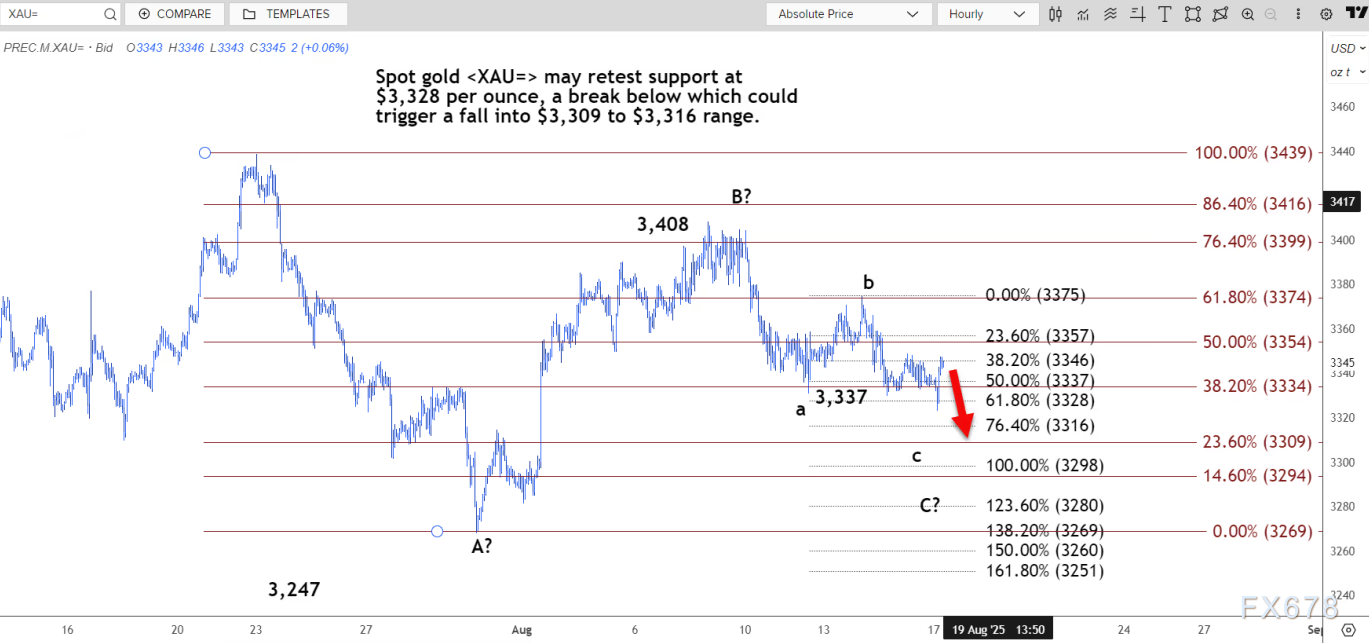 路透技术分析师指出,现货黄金可能重新测试每盎司 3328 美元的支撑位,跌破该水平可能导致金价跌至 3309 美元至 3316 美元的区间。