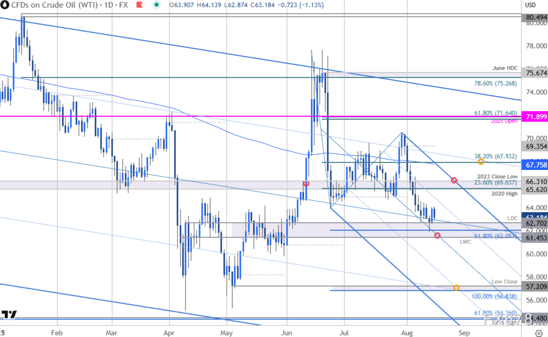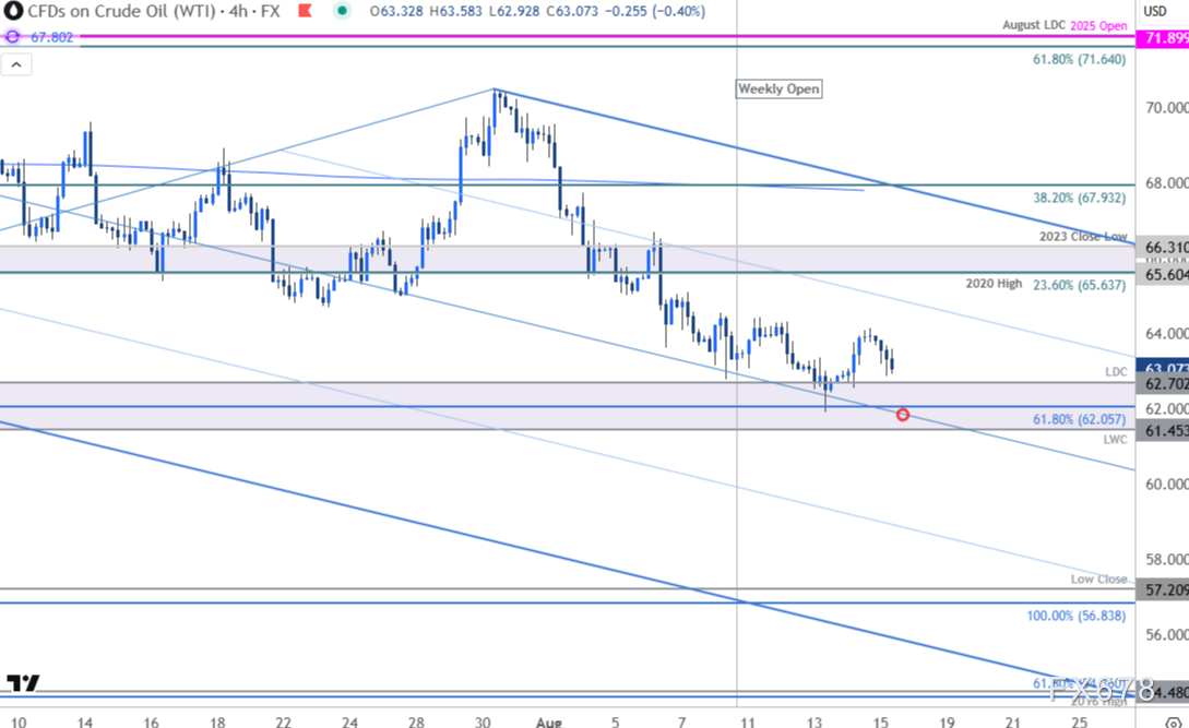 从WTI日线图来看,油价自7月高点已连续七日陡峭下跌,目前价格运行在由6月高点延伸的修正版安德鲁音叉通道内。值得注意的是,中线在未来数日内将与61.45-62.70美元支撑带交汇,进一步凸显该关口的技术重要性。只要价格维持在该支撑上方,短期看跌立场就存在变数。