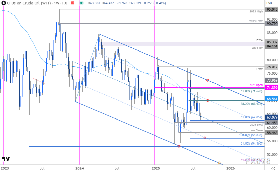 技术展望:在上月的油价预测中,WTI原油已从年度下降趋势阻力位反转,并强调若价格延续下行,反弹幅度应受限于年度开盘价。尽管月末反弹使油价较7月低点回升近9%,但在触及年度开盘价前便已耗尽动能。随后跌势延续,目前较7月高点已下挫逾12%,上周WTI正测试64.45-62.70美元的关键支撑枢轴区——该区域由年度最低周收盘价(LWC)、6月跌势的61.8%延展位及2025年最低日收盘价(LDC)共同构成。我们正密切关注该区域的价格反应,唯有收于该支撑下方方能确认长期跌势重启。