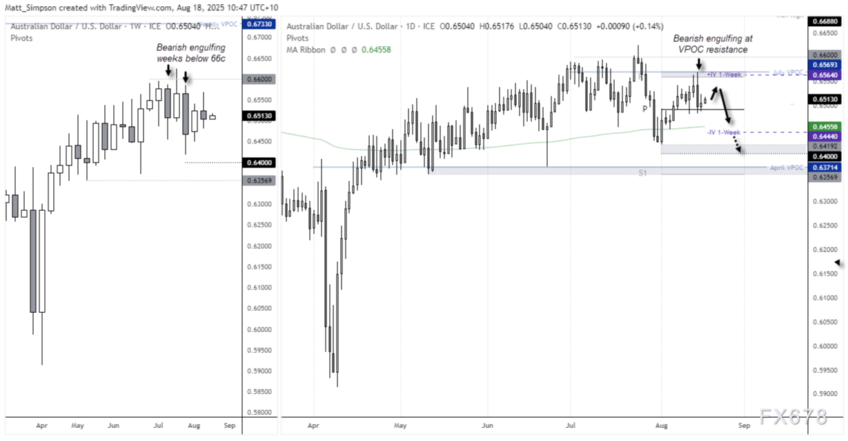 令人玩味的是,周四“看跌吞没”形态的高点精准承压于7月成交量控制点(VPOC)阻力位,而周五在月线枢轴点上方的“倒锤线”形态正尝试推动价格回升。但鉴于周线与日线时间框架已同步形成“更低高点”的看跌吞没形态,因此倾向于判断汇价将开启新一轮跌势,下探0.6400关口。