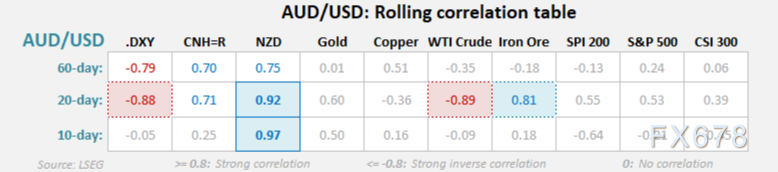 过去10个交易日中,澳元兑美元与华尔街主要股指(标普500、SPI 200、沪深300)的相关性转为负值,这明确释放出风险情绪已非澳元走势主导因素的信号。
