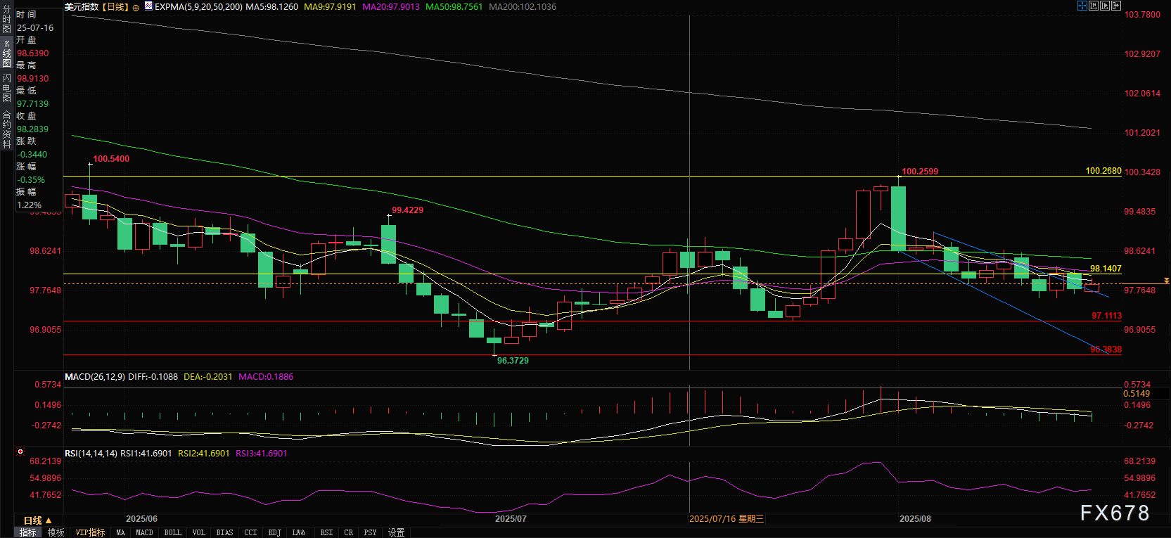 盈凯外汇官网报道——周一(8月18日)欧市时段,衡量美元兑六大主要货币价值的美元指数(DXY)交投于98.00附近,较前一交易日纽约汇市收盘价97.85微幅波动,整体维持窄幅震荡格局。日线图技术分析显示,美元指数仍处于下降通道形态内运行,暗示整体维持看跌基调。