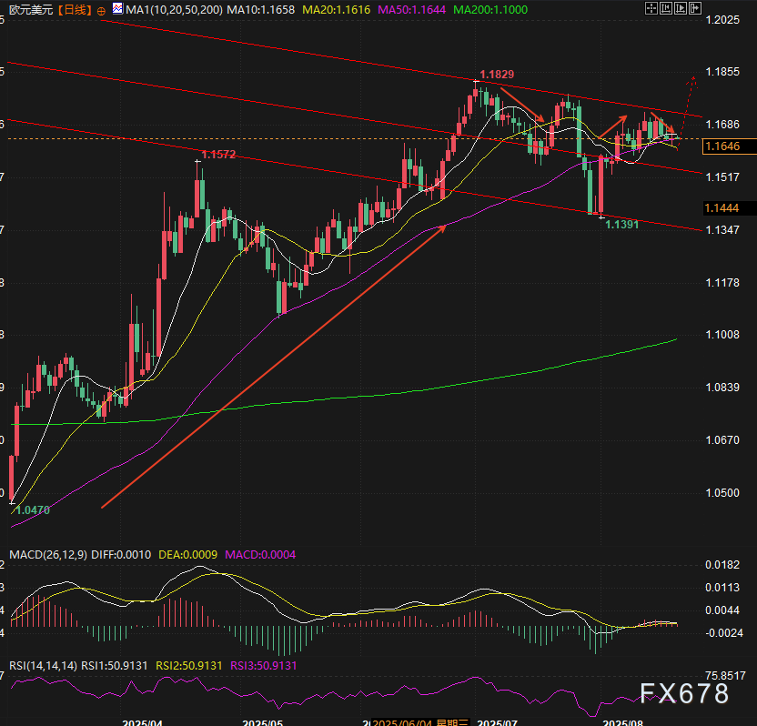 盈凯外汇官网报道——周四(8月21日)亚洲交易时段,欧元兑美元继续沿着50日均线,在1.1650一线窄幅整理,截至当前,汇价交投于1.1647附近,微跌0.02%,多空力量暂时均衡。美联储7月会议纪要释放的政策信号与特朗普对美联储官员的施压形成显著博弈,成为短期汇率波动的核心驱动。美联储会议纪要公布后,周三欧元兑美元快速从当日高点1.1672回撤,反映市场对政策预期的敏感反应。走势上交易员在提前押注欧洲各国PMI的放缓预期,使欧元兑美元承压。