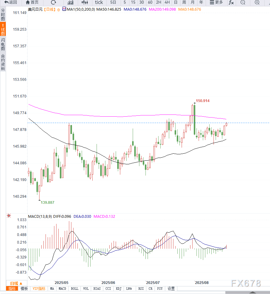 从技术面看,美元兑日元在148.00一线突破了近三周的震荡区间上沿,释放出上行动能。日线图指标偏向多头,显示价格仍有进一步走高的空间。