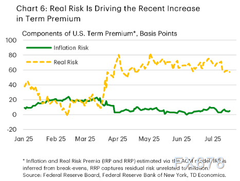 Chart7显示了2025年1月20日至8月5日期间美国期限溢价的构成(单位:基点)。通胀风险溢价(从盈亏平衡通胀率推算)从1月至4月初的平均18个基点降至之后的6个基点;实际风险溢价(根据Adrian-Crump-Moench模型残差计算)同期从平均20个基点升至63个基点。