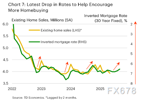 在购房能力持续紧绷的背景下,抵押贷款利率的每一点下降都应有助于刺激销售活动(两者存在高度相关性,见Chart7)。