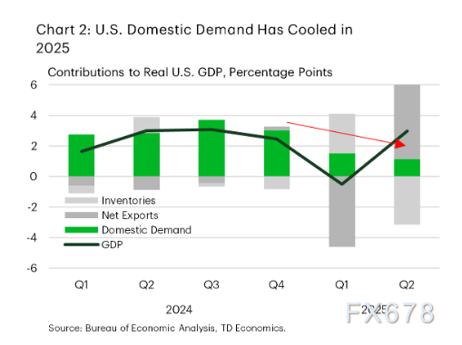 Chart2显示过去六个季度对实际GDP增长的贡献组成。2025年上半年国内需求(含消费支出、固定投资与政府支出)明显放缓,而净出口剧烈波动导致GDP在第一季度收缩后于第二季度增长3%。