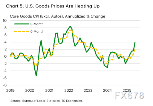 但核心商品价格指标的趋势不容乐观。单个品类正在掩盖广泛价格压力的复苏。由于库存增加及需求收缩,自3月汽车关税首次宣布以来,新旧车价格已下降1%。除此之外,其他所有商品价格(以CPI通胀衡量)在过去三个月年化涨幅近4%(Chart5)。