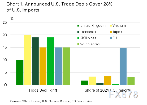 截至目前,已有七个国家和地区与美国谈判贸易安排:英国、越南、印度尼西亚、日本、菲律宾、欧盟和韩国。这些国家和地区合计占美国进口总额的四分之一强,适用关税税率在15-20%之间浮动,唯独英国获得10%的优惠税率(Chart1)。