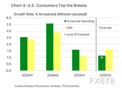 题目为《美国消费者踩下刹车》的Chart4显示了2024年与2025年实际消费者支出与GDP增长情况。数据显示消费增速已从2024年上半年的2.5%和下半年的3.5%,放缓至今年上半年的1.6%。道明经济学预计2025年下半年增速将进一步放缓至0.9%。
